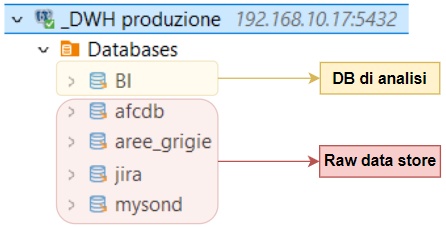 Il data warehouse che stiamo utilizzando è costituito sostanzialmente da un'insieme di database relazionali postgreSQL su server remoto accessibile tramite VPN.