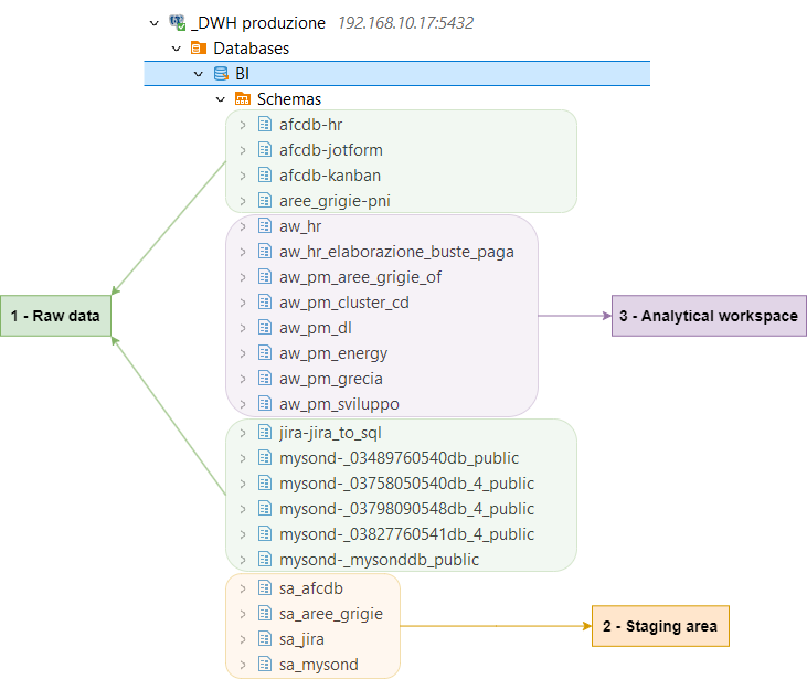 Gli schemas presenti all'interno del DB BI, come mostrato nell'immagine seguente, possono essere suddivisi idealmente in tre categorie: