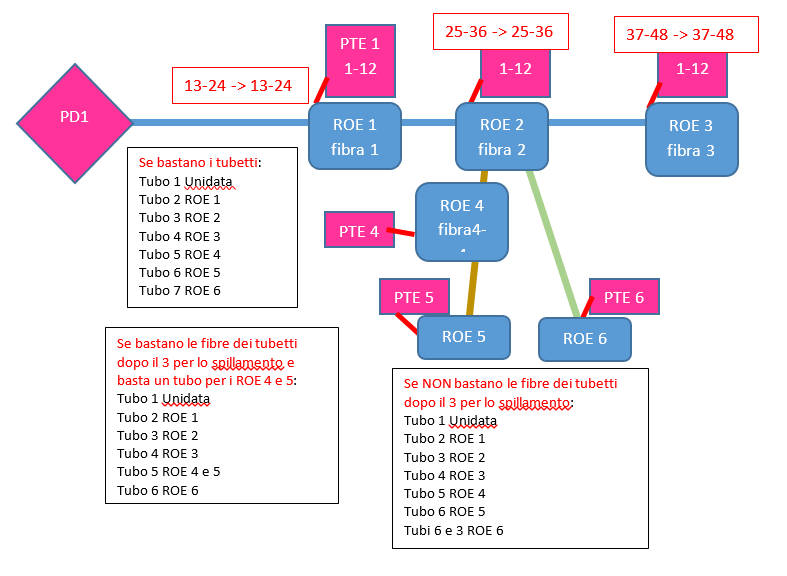 Nei collegamenti da PFS a PD e da PD a ROE verranno utilizzati cavi con potenzialità adeguata, con tubetti da 12 o 24 fibre, rispettando le seguenti regole: