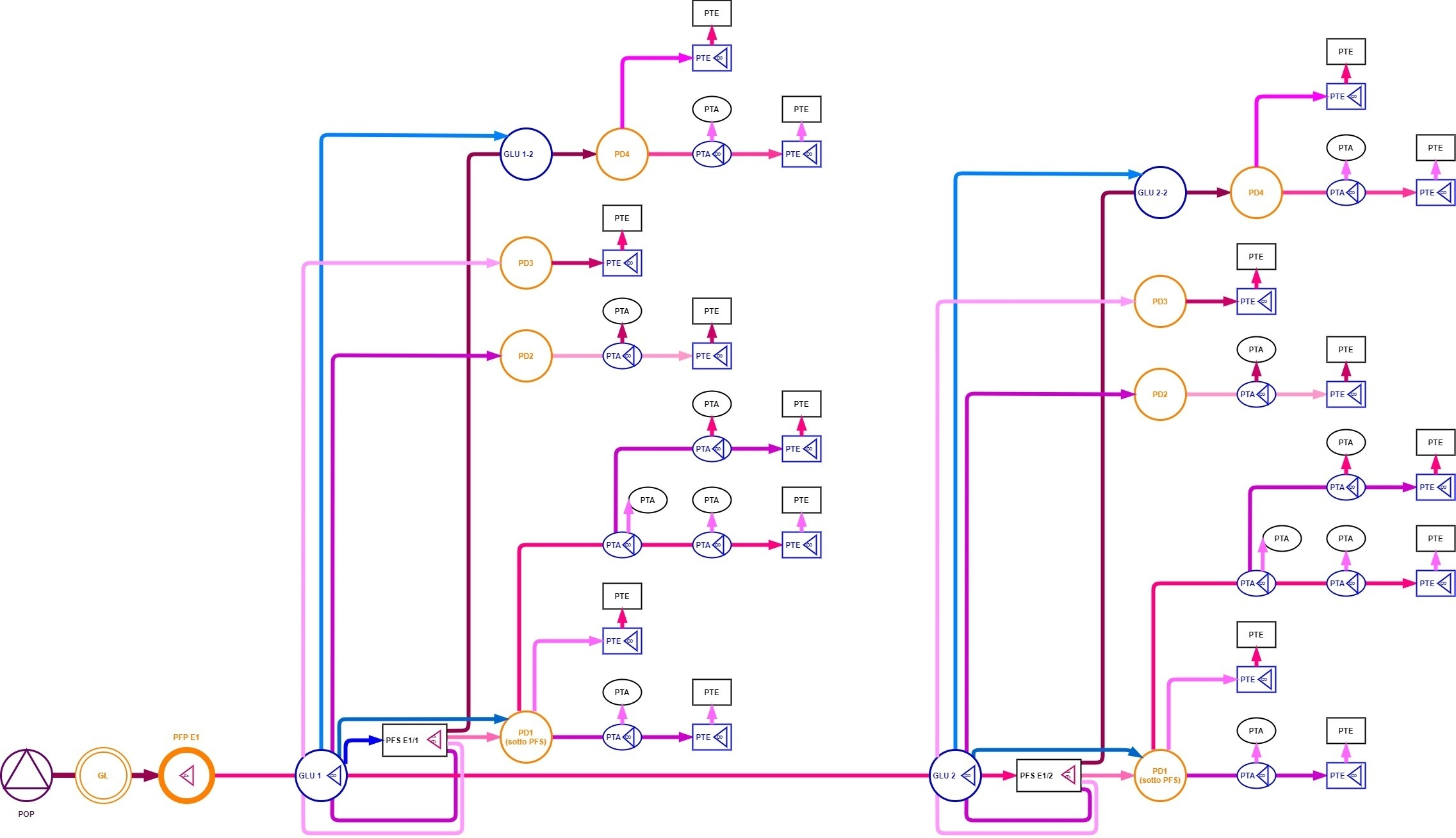 Per i collegamenti tra PFP e PFS verranno utilizzati cavi da 192 fibre ottiche, sempre con tubetti da 24 fibre. In caso di cascate di PFS, si utilizzeranno cavi da 288 fibre ottiche, mantenendo la stessa struttura dei tubetti.