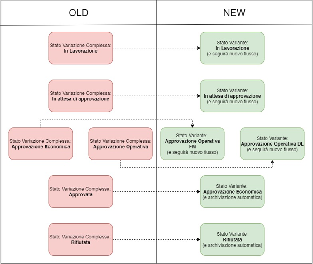 Per chiarezza, viene quindi riportato di seguito uno schema che esemplifichi come si andrà ad intervenire su detto pregresso, modificando gli stati in accordo al nuovo workflow prospettato: