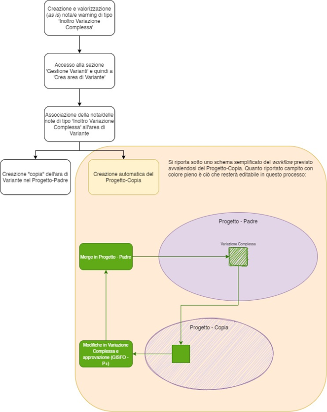 Il Progetto-Copia sarà, come intuibile dal nome, una copia del Progetto orginale (denominato Progetto-Padre), e dell’area di variazione complessa associata, che verrà automaticamente creato dal sistema all’apertura di un’area di variazione complessa (to be ‘Area di Variante’).