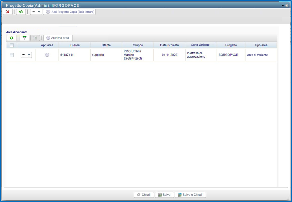 Sarà poi possibile accedere al dettaglio del Progetto-Copia, e quindi all’area di Variante, cliccando sulla riga apposita presente sulla maschera ‘Progetto-Copia’.