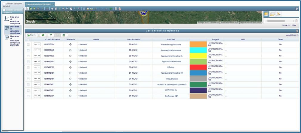 Come già in essere in GISFO, la colorazione in mappa di un’area di variazione complessa cambia a seconda dello stato della variazione stessa. Tale logica verrà ovviamente mantenuta anche nell’ambito di questo sviluppo, andando ad aggiornare la colorazione delle aree. Più nello specifico, verrà eliminato lo stato ‘Approvazione operativa’ e sostituito con gli stati ‘Approvazione operativa DL’ e ‘Approvazione operativa FM’.
