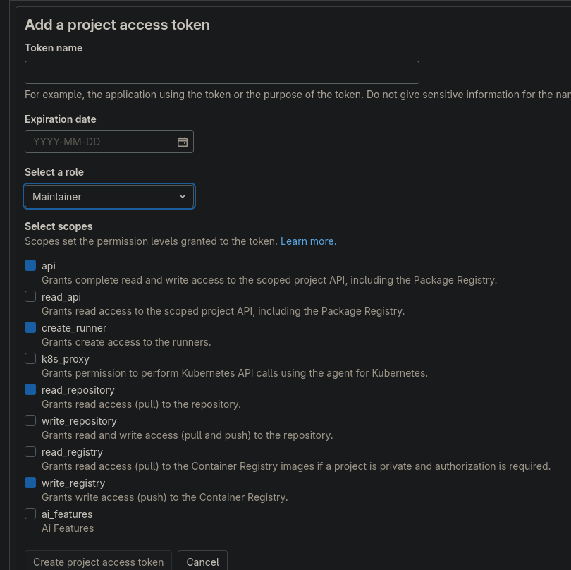 Nel singolo progetto è necessario creare un token di accesso alla repo (ci serve per accedere al container registry)