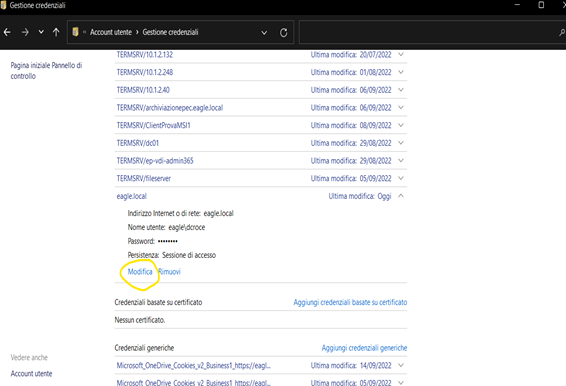 3. Cercare Sotto la voce credenziali Windows eagle.local, come evidenziato e cliccarci: |