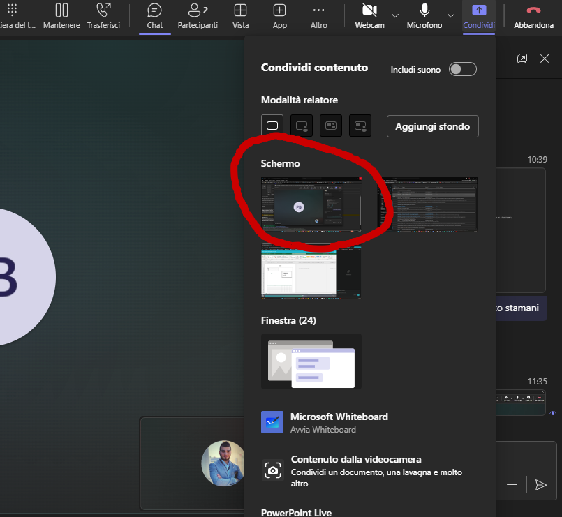 Si aprirà un menu in basso o una finestra. Qui puoi scegliere se condividere l'intero Schermo (tutto ciò che vedi) o una singola Finestra (solo un programma specifico).