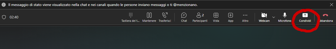 Dalla finestra della riunione, guarda in alto a destra e fai clic sul pulsante Condividi.