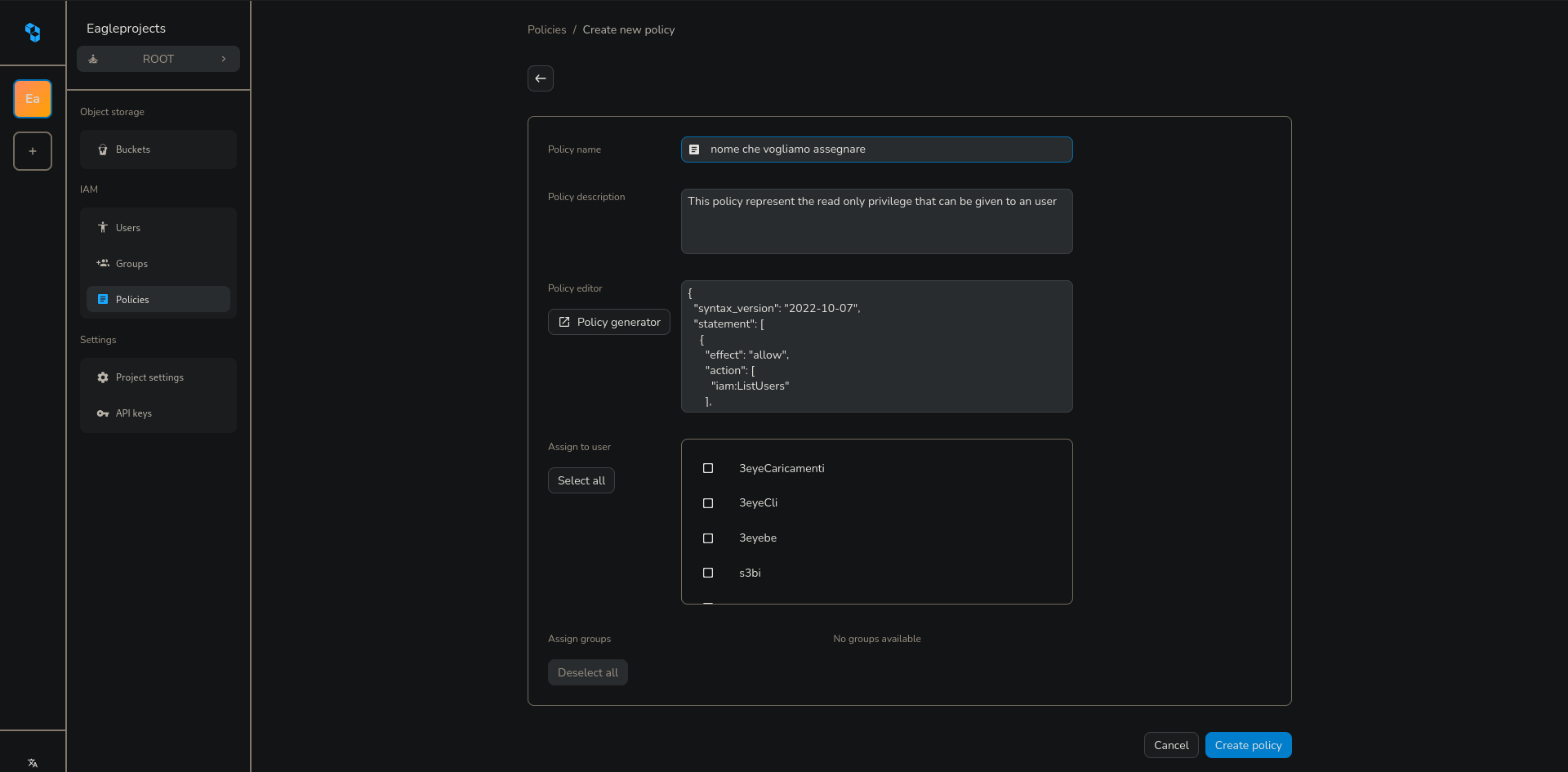 nella creazione delle rules c'è un bug per cui è impossibile creare una nuova policy custom, ne va prima clonata una di quelle di base (esempio Readonly)