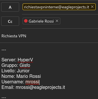 per richiedere la VPN inviare una mail a richiestavpninterne@eagleprojects.it mettendo in CC il proprio Team Area Manager