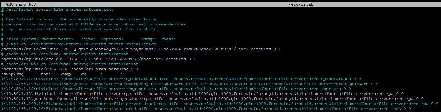Osservando le ultime righe non commentate, vediamo che al parametro "credentials" abbiamo il percorso di dove è salvato il file con le credenziali dell'utente del fileserver.