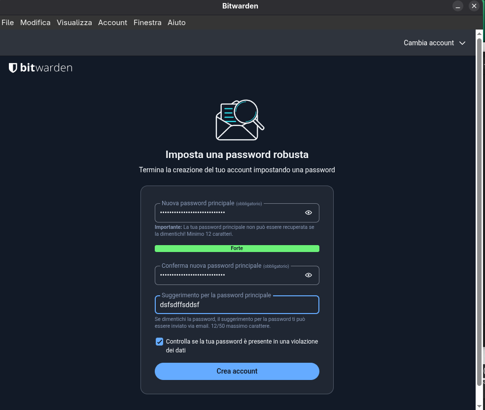 ATTENZIONE QUESTA PARTE È LA PIÙ DELICATA! SCEGLIERE BENE UNA PASSOWRD SEGUENDO QUESTA GUIDA https://wiki.eagleprojects.cloud/books/bitwarden/page/creazione-di-una-password