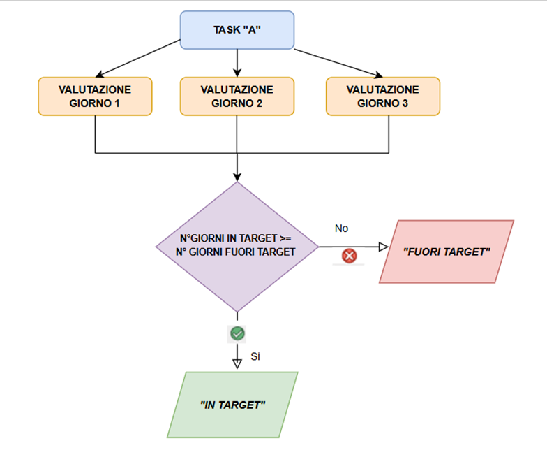 - se il numero di giorni (nell’intervallo scelto) in cui Valutazione target = “In target” è >= al numero dei giorni (dell’intervallo scelto) in cui la Valutazione target = “Fuori target” allora la valutazione globale del task per quell’intervallo di tempo sarà “In target”
