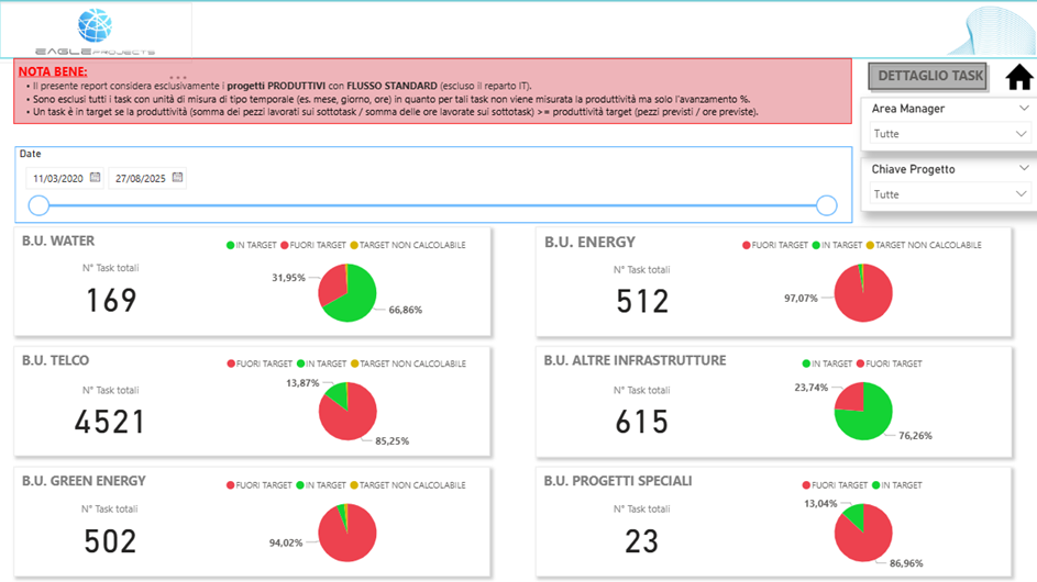 In questa sezione è possibile monitorare quotidianamente la produttività di ciascuna Business Unit aziendale, mostrando la percentuale dei Task In Target, Fuori Target e con Target Non Calcolabile: