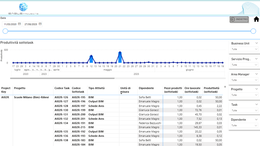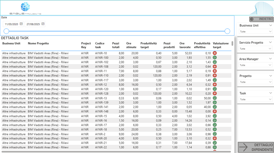 dove è possibile visualizzare il dettaglio della produttività dei singoli Task filtrabile per: giorno, Progetto, Task, Business Unit, Area Manager e Valutazione Target.