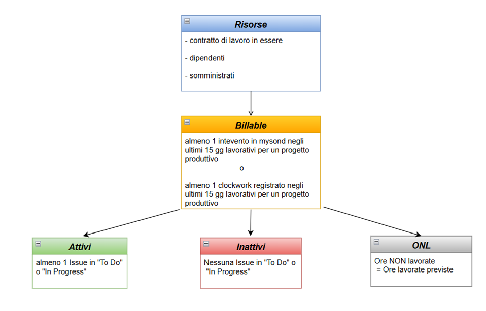 Viene poi riportato il dettaglio, tra le risorse billable, di quelle che ad oggi sono “Attive”, “Inattive” o hanno “ONL” classificate come segue: