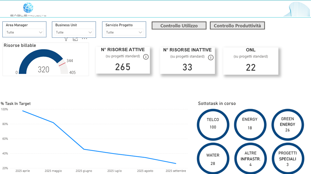 Nella Dashboard viene riportato il dato delle risorse “billable” ad oggi; valore posto a confronto nel misuratore con il valore totale delle risorse Eagleprojects e con il target delle risorse billable (il 15% in meno del totale risorse) rappresentato dalla linea rossa.